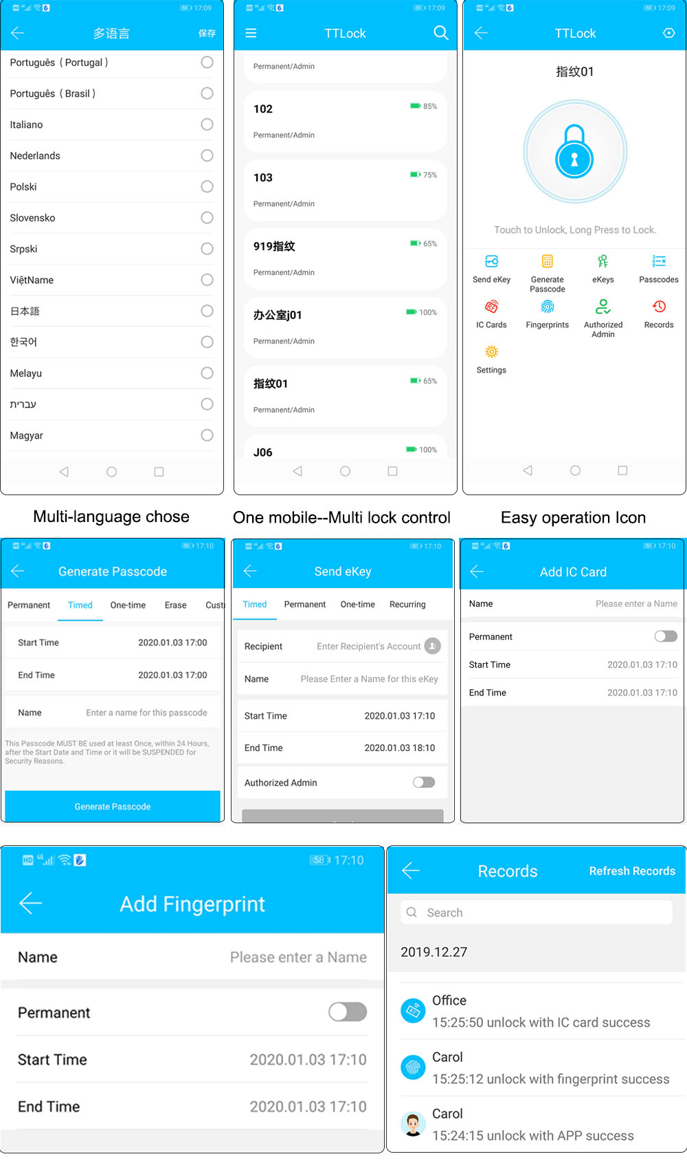 Unlock: Mifare card+password+Fingerprint+ Mobile APP(by bluetooth)+wifi(need gateway)+remote controller.
