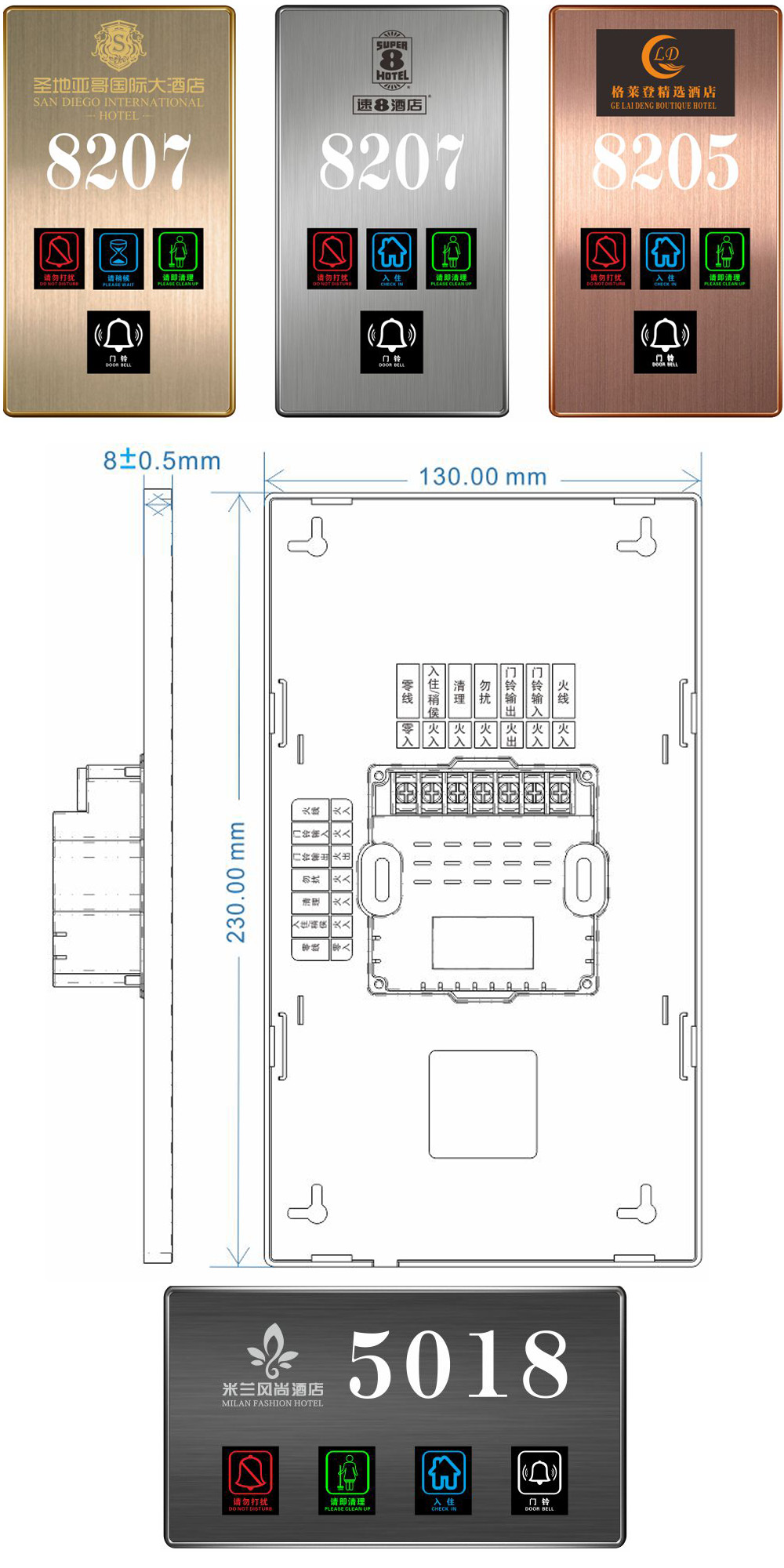Function: LOGO、room number、no disturb、make up 、check-in 、doorbell